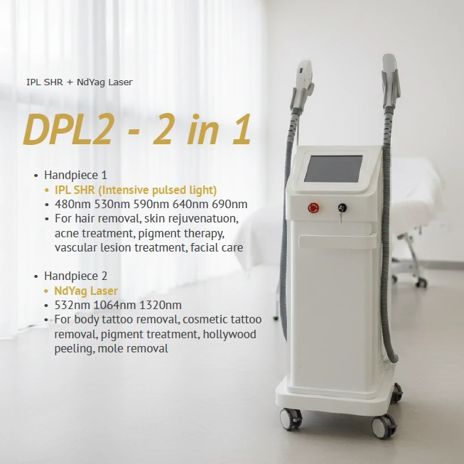 This 2‑in‑1 aesthetic multifunctional machine combines (IPL SHR OPT and Nd:YAG laser) 2 different systems, delivering professional, efficient, and safe treatments for hair removal, skin rejuvenation, pigment correction, vascular lesions, acne, tattoo removal, and carbon peeling. The multi functional ipl machine is widely used in beauty salons, clinics, and medical centers.